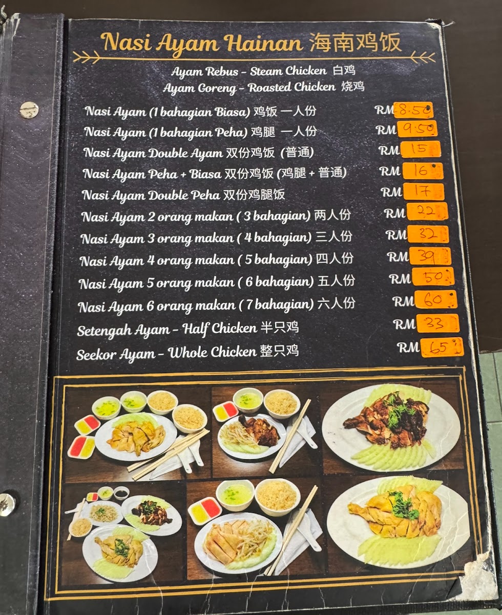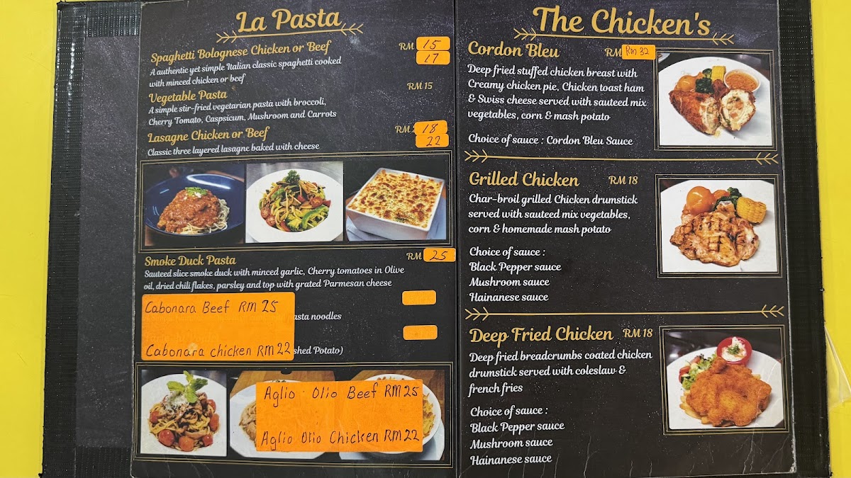 The menu offers a variety of Asian fusion dishes with an emphasis on Hainanese-style chicken rice alongside several Western-inspired options. Visitors can expect a selection of main courses featuring grilled chicken, roasted chicken, and fish dishes, complemented by sides such as mashed potatoes, coleslaw, and garlic bread. The food section includes items like Beef Wellington, Rib Eye Steak with Black Pepper Sauce, and Fish and Chips. Additionally, there are lighter options such as mushroom soup and spaghetti carbonara.